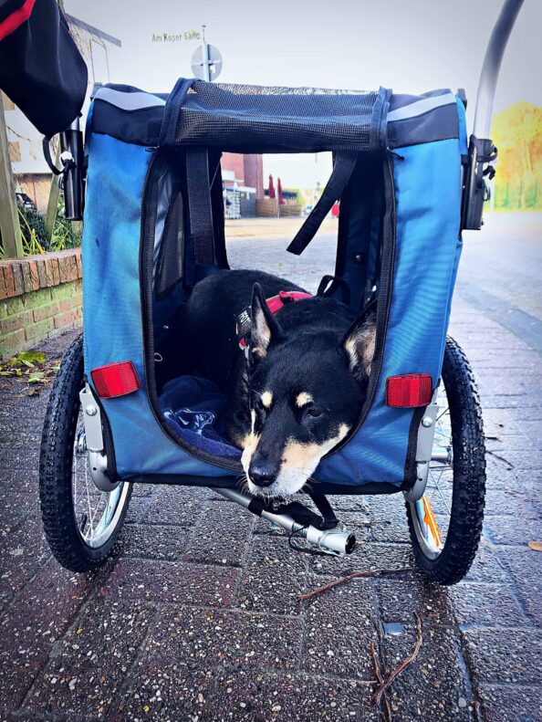 Dass der Transportwagen von Leonpets auch geschoben werden kann, hat bei uns die große Wende gebracht. Seitdem liegt meine alte Hündin gerne in ihrer „Kutsche“, sie tippelt selbständig zum Eingang und wartet darauf, dass sie einsteigen darf und mittlerweile ist es sogar so, dass sie in dem Hänger einschläft.